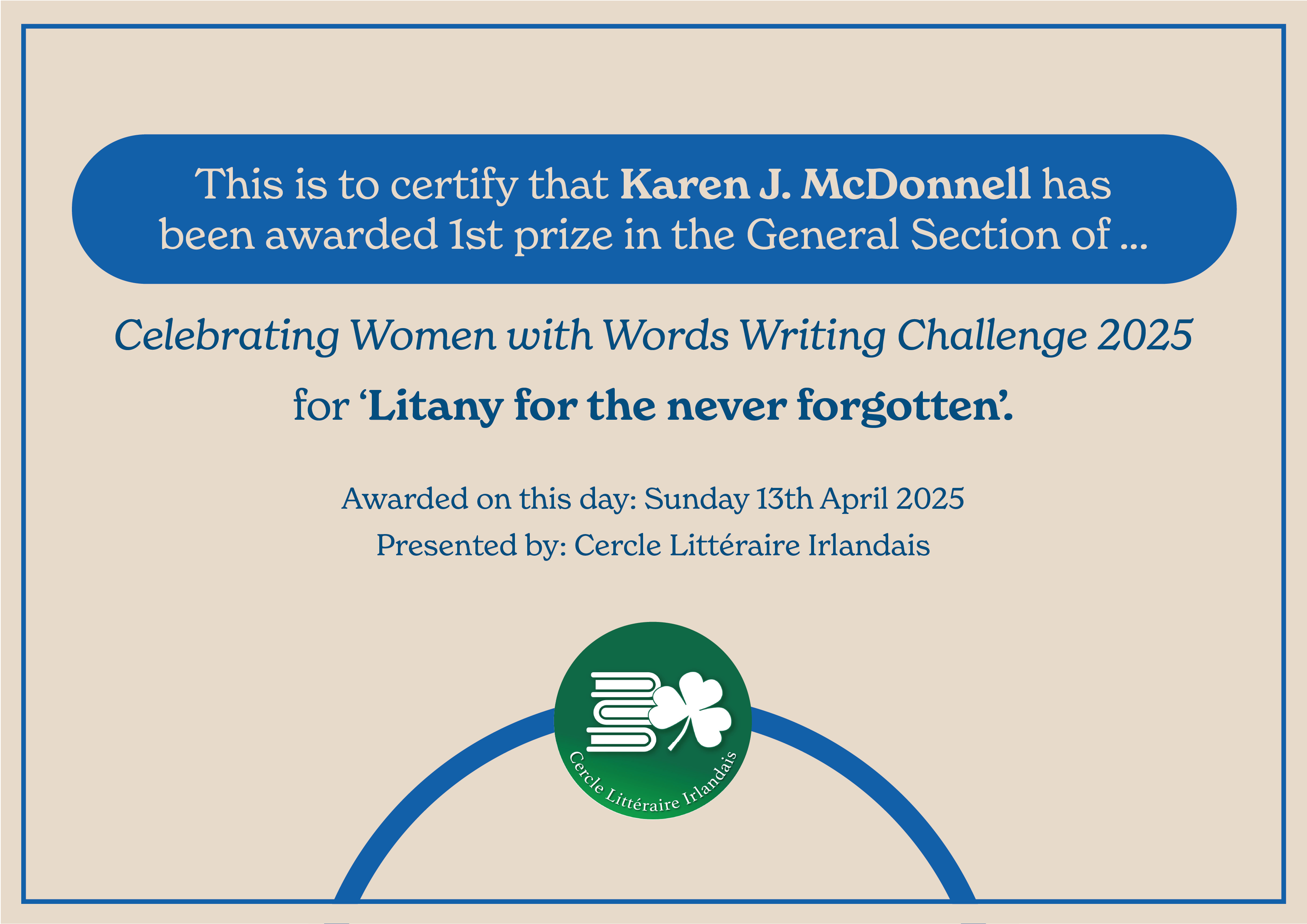 Winner, Celebrating Women With Words 2025 – ‘Women & Freedom’; Cercle Littéraire Irlandais, Paris